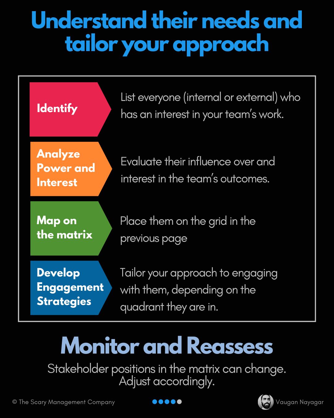 Start by listing everyone who has an influence over, or an interest in, your team’s success. This could be executives, customers, peers, even informal influencers.