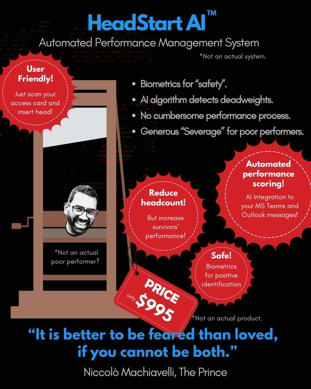 But no worries! At scarymanagement.com, we have developed HeadStart AI a cutting edge French Guillotine product that automates these troubles for you! For a limited time only, you can get the HeadStart AI automated performance management system for only $995!