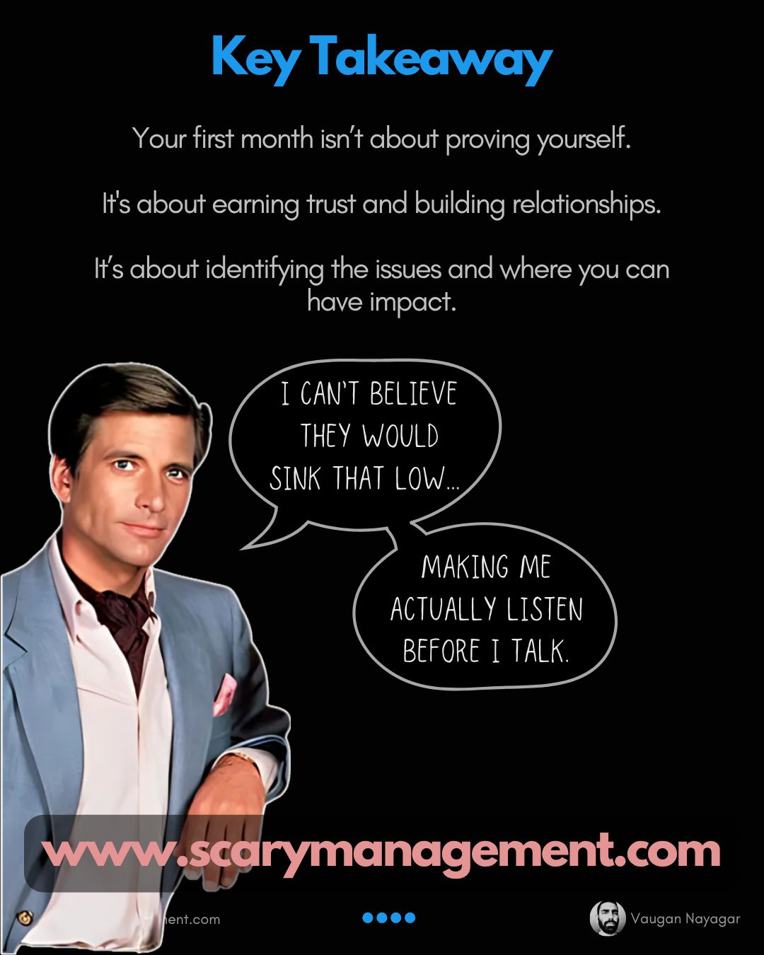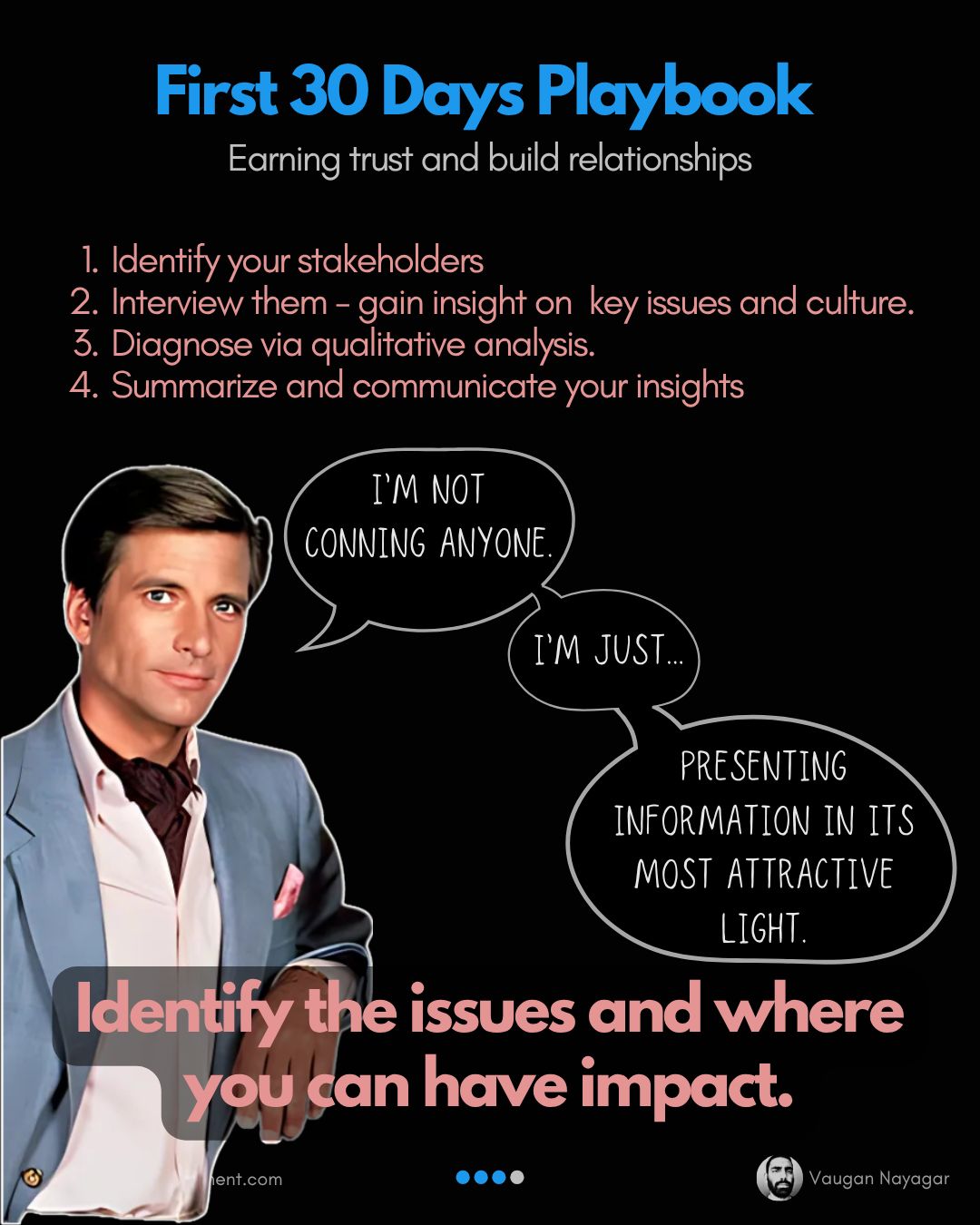 At the end of 30 days summarize and share your findings. This will serve as input to the second 30 days, where you devise a strategy to match the situation/diagnosis.