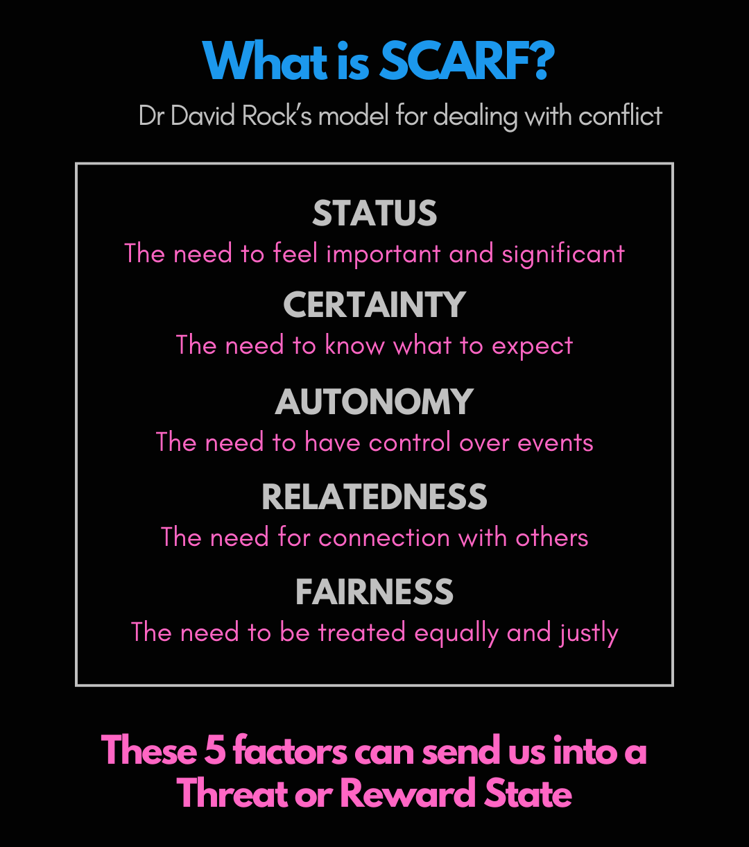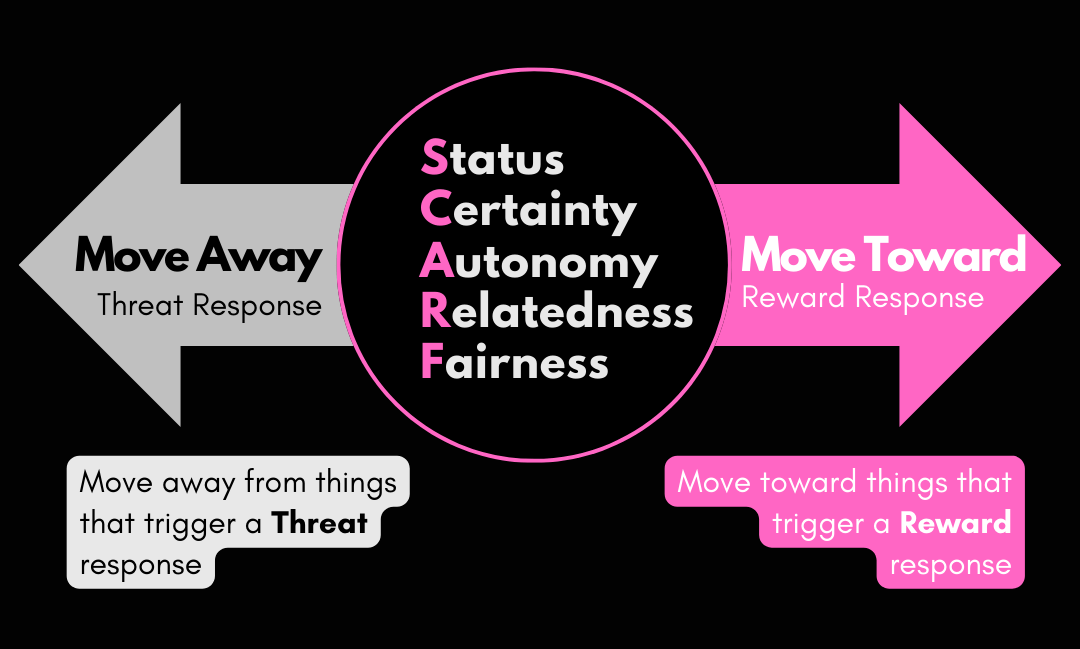 There are 5 factors that elicit a threat or reward response. Understanding these factors can help us manage conflict and de-escalate situations in our teams.