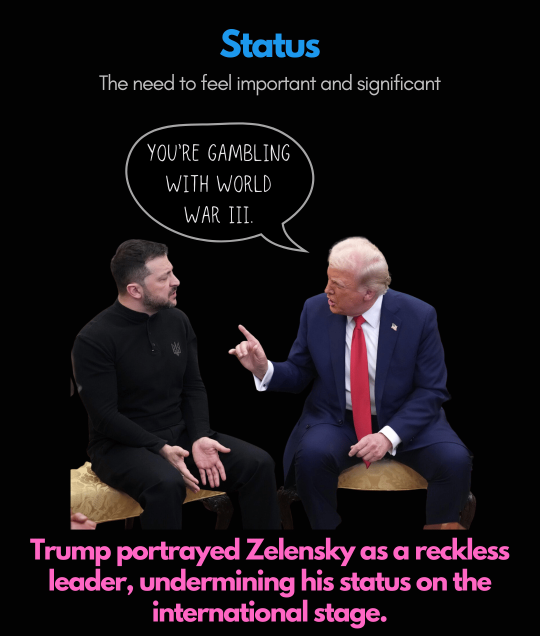 Imagine if Trump had publicly acknowledged Zelensky's wartime leadership courage (status) and Zelensky had recognized Trump's global influence (also status)?