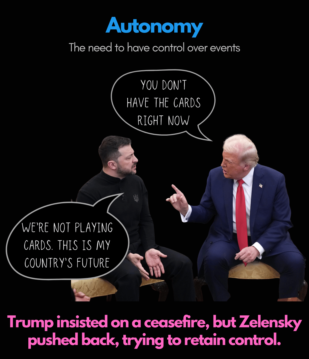 Trump’s insistence on a ceasefire (despite the fact that Putin had violated previous agreements) threatened Ukraine’s/Zelensky’s sovereignty and decision-making power.